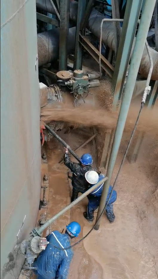 6:30分劉武到達(dá)三燒現(xiàn)場。更換工作服和雨衣后,投入到漏漿堵塞過程中。因漏漿孔太大,塔內(nèi)漿液泄露量大,壓力大,漿液溫度高,在嘗試幾次使用破布和木削封堵無果后,開始采用其他封堵措施。經(jīng)過幾次嘗試封堵,劉武全身已被噴涌而出的漿液打濕。為了爭分奪秒的解決漿液泄露,劉武顧不上打濕的衣服,經(jīng)過現(xiàn)場與生產(chǎn)部、班組長和崗位人員溝通后,決定采用一根木棍一端抵靠在循環(huán)泵支架梁上,一端封堵漿液泄露位置,F(xiàn)場準(zhǔn)備好相關(guān)材料后,大家齊心協(xié)力,不怕困難,勇往直前,幾次嘗試后最終將木棍抵靠在循環(huán)泵支架梁和吸收塔漏漿位置,成功將漿液泄露堵住。
