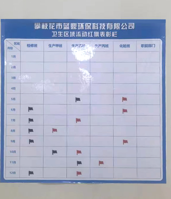 為促進工作環(huán)境衛(wèi)生持續(xù)向好發(fā)展,2023年5月,集團為各公司做了衛(wèi)生分區(qū)與責任劃分,同時設(shè)立衛(wèi)生流動紅旗制度,以評估每個班組的衛(wèi)生清潔情況。紅旗代表該班組的本月衛(wèi)生情況最好,黑旗則代表衛(wèi)生情況不佳,需要整改。到12月底,攀藍鼎、西昌藍鼎、威遠藍鼎2023年度各個班組的衛(wèi)生流動紅旗評選結(jié)果已出爐。